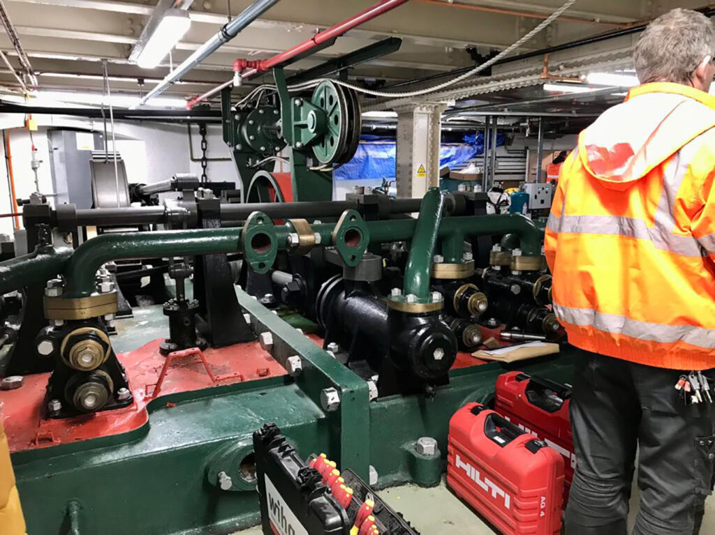 During our inspections, our team was given access to the bridge’s internal structures, including the enormous bascules that lift to allow river traffic to pass. Originally powered by steam hydraulics and vast accumulators, the system is now operated by oil and electricity, with the original machinery preserved within the Tower Bridge Engine Rooms.